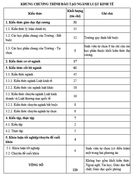 Chương trình đào tạo trình độ đại học ngành Luật Kinh tế trang bị cho sinh viên kiến thức cơ bản về các lĩnh vực kinh tế – xã hội, quản lý và pháp luật. Đặc biệt, sinh viên sẽ được đào tạo chuyên sâu về Luật Kinh tế với hai chuyên ngành, Luật Thương mại quốc tế và Luật Kinh doanh với định hướng kết hợp rèn luyện kĩ năng nghiên cứu và thực hành pháp luật về lĩnh vực kinh tế. Kết quả đào tạo của Chương trình đào tạo ngành Luật Kinh tế trình độ đại học ngành Luật Kinh tế là Cử nhân Luật Kinh tế có phẩm chất chính trị, đạo đức, kiến thức và năng lực tốt để có thể giải quyết được các vấn đề cơ bản trong lĩnh vực pháp luật kinh tế, đáp ứng yêu cầu của sự nghiệp công nghiệp hoá, hiện đại hoá đất nước, xây dựng Nhà nước pháp quyền Việt Nam trong tiến trình hội nhập quốc tế. Đồng thời, sau khi tốt nghiệp, người học có đủ điều kiện để tiếp tục học tập các chương trình đào tạo sau đại học ngành Luật Kinh tế và các ngành Luật khác tại Việt Nam, các quốc gia trong khu vực và thế giới.