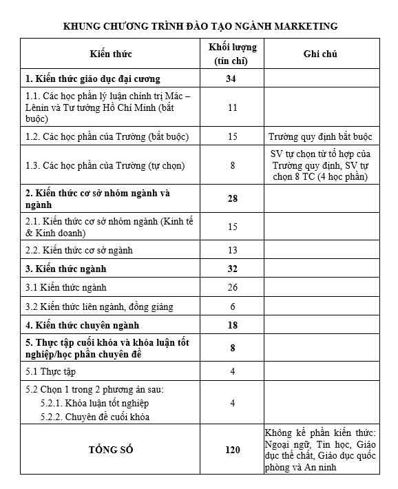 Sau khi hoàn chỉnh chương trình, sinh viên sẽ hiểu biết được các Kiến thức và lập luận ngành: Kiến thức toán và khoa học cơ bản, Kiến thức cơ sở trong lĩnh vực kinh tế và kinh doanh, Kiến thức chuyên ngành Marketing.